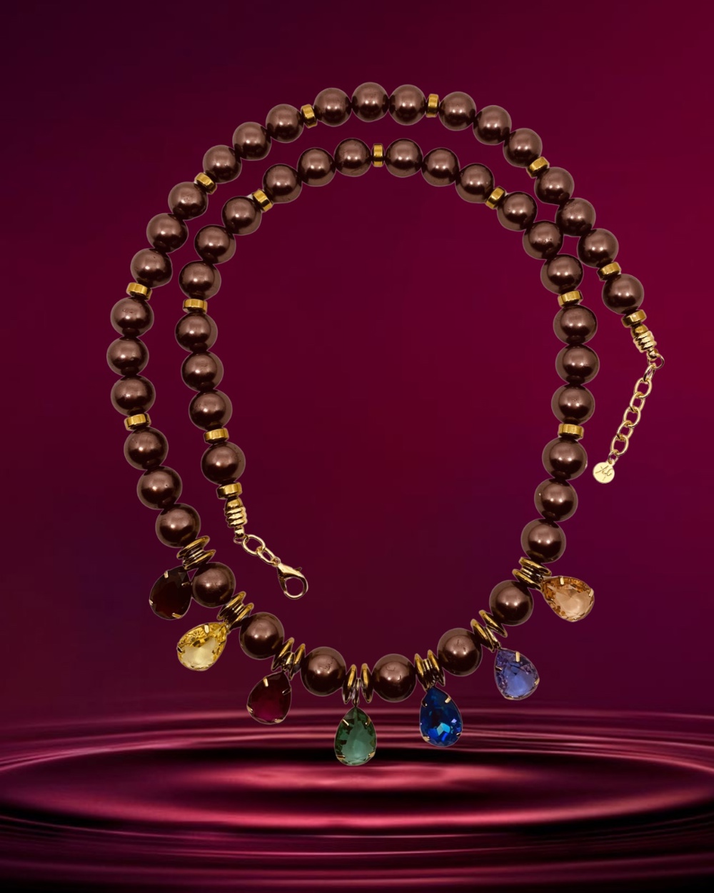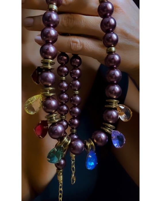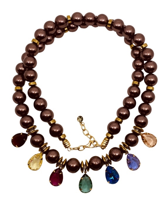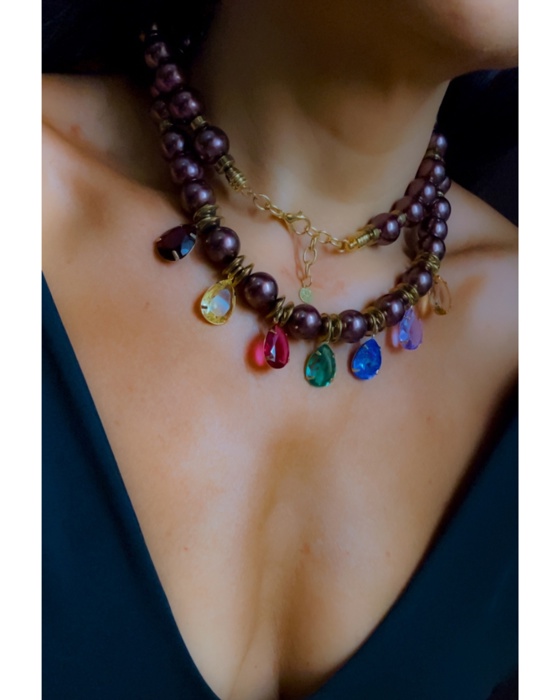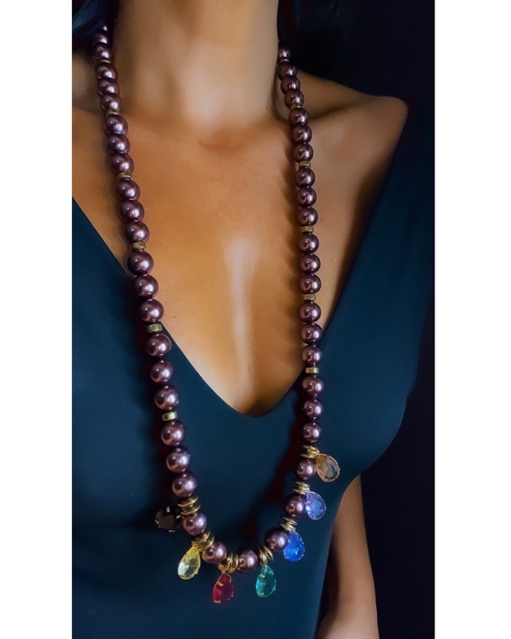 Colar longo em perolas de vidro marrom, pedras hematitas, cristais coloridos.