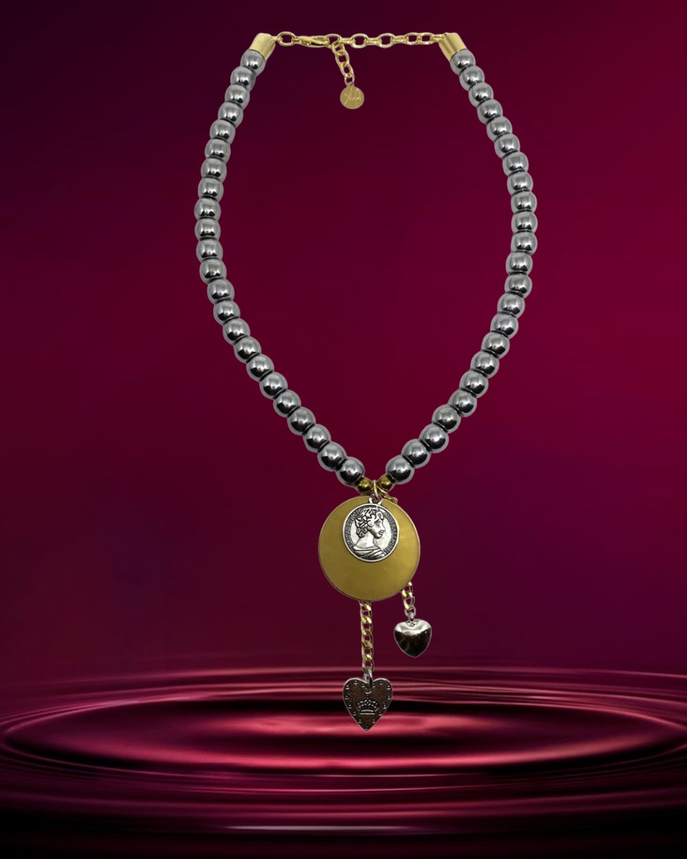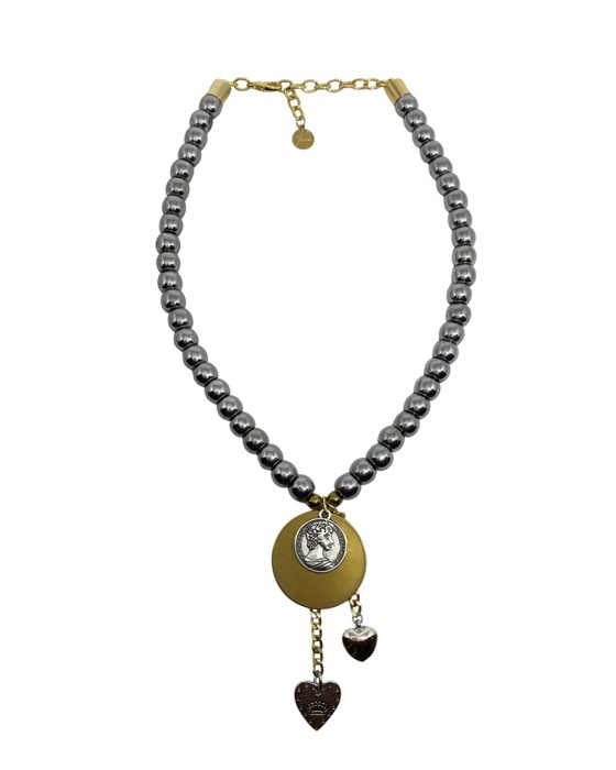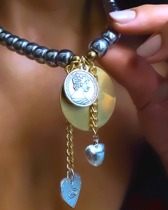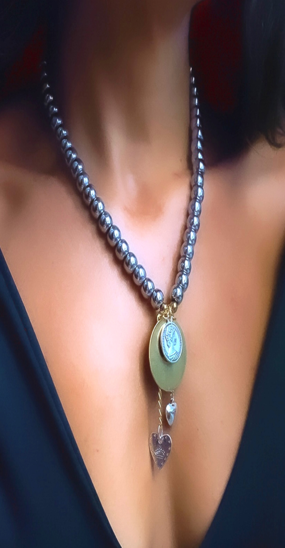 Colar em pedras hematitas prata, corrente e medalhas ouro e prata.