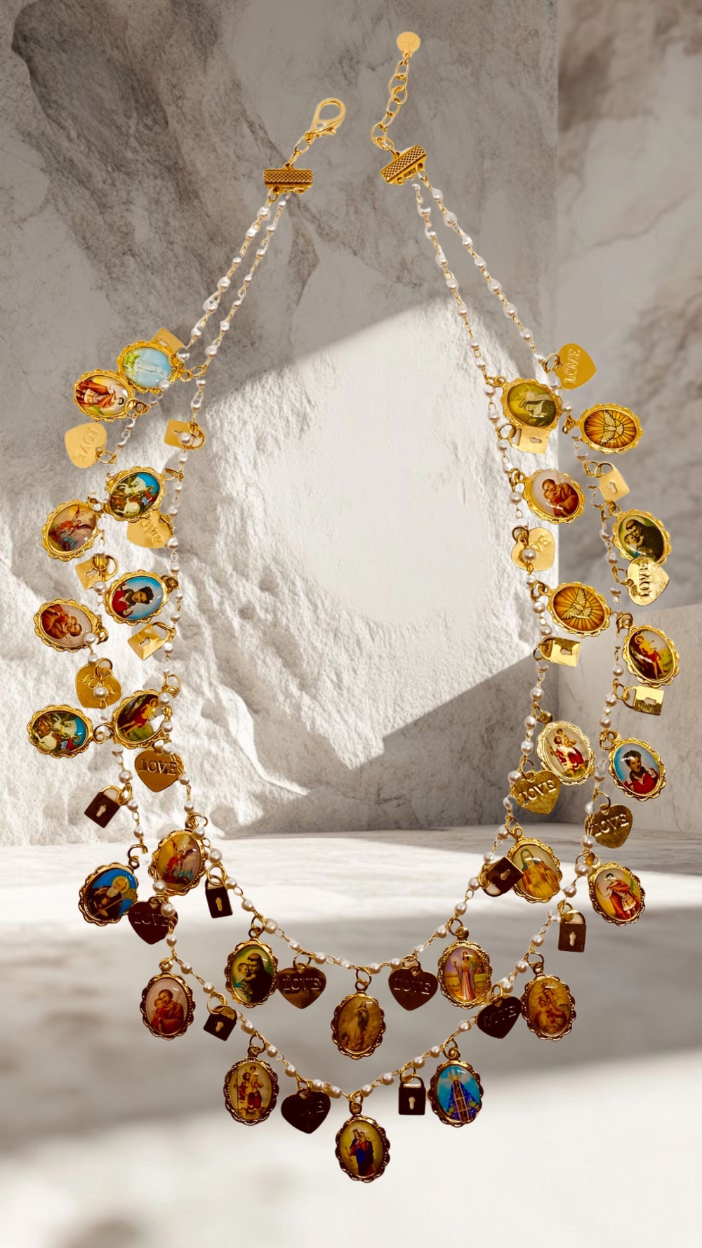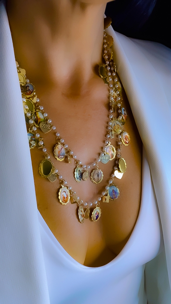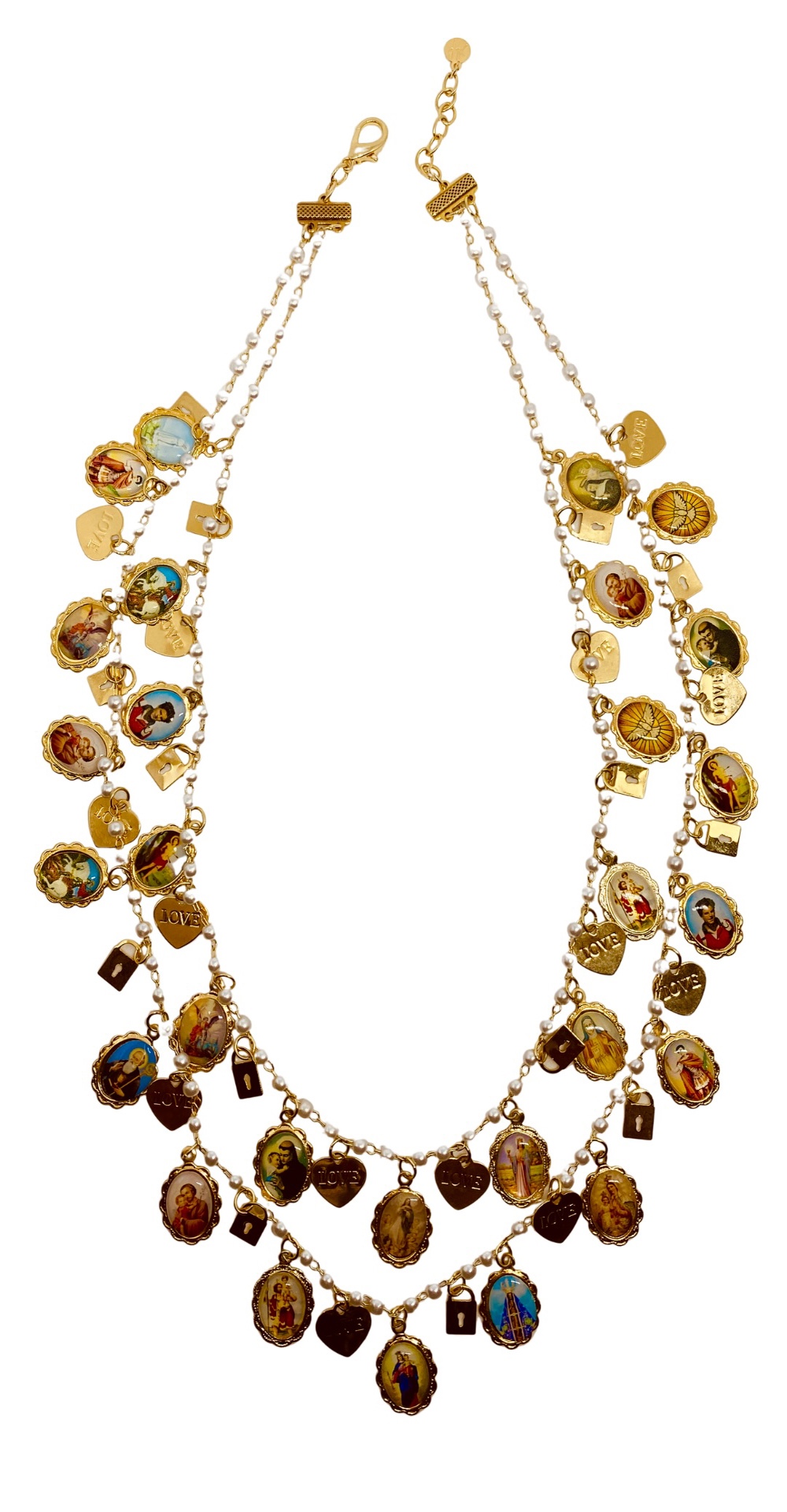 Colar duplo , corrente em perolas, santos catolicos , medalhas coracoes love e cadeados