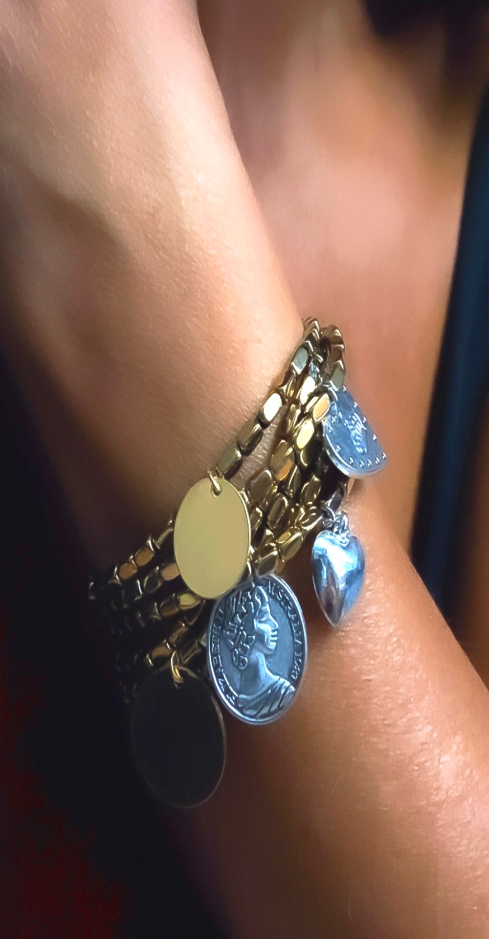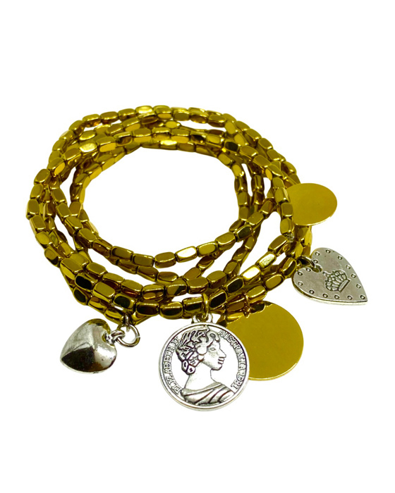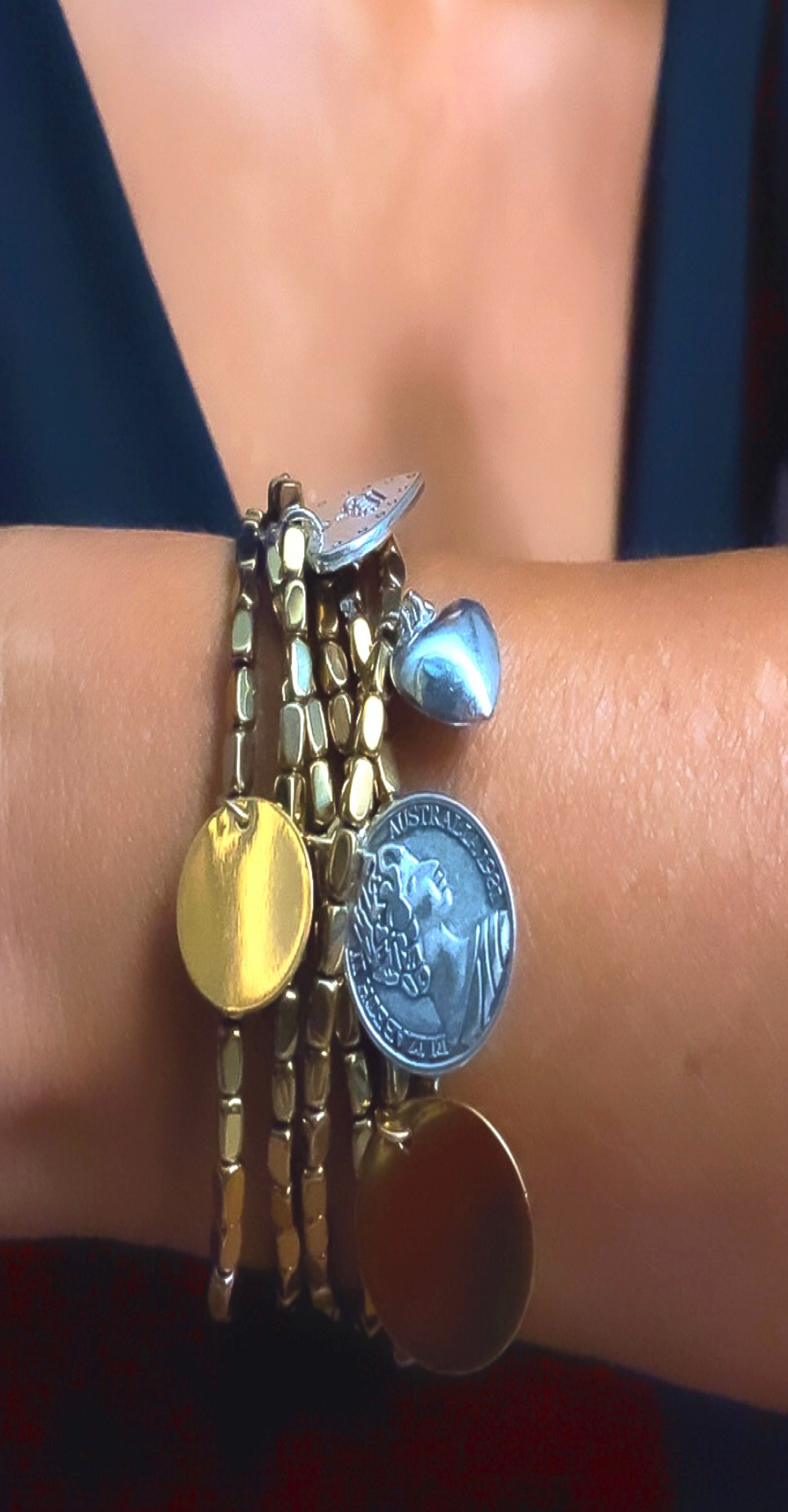 Kit de 6 pulseiras em pedras hematistas ouro , berloques prata e ouro