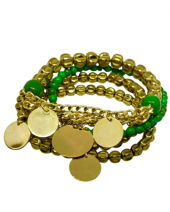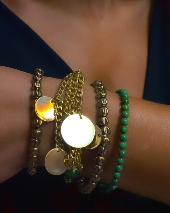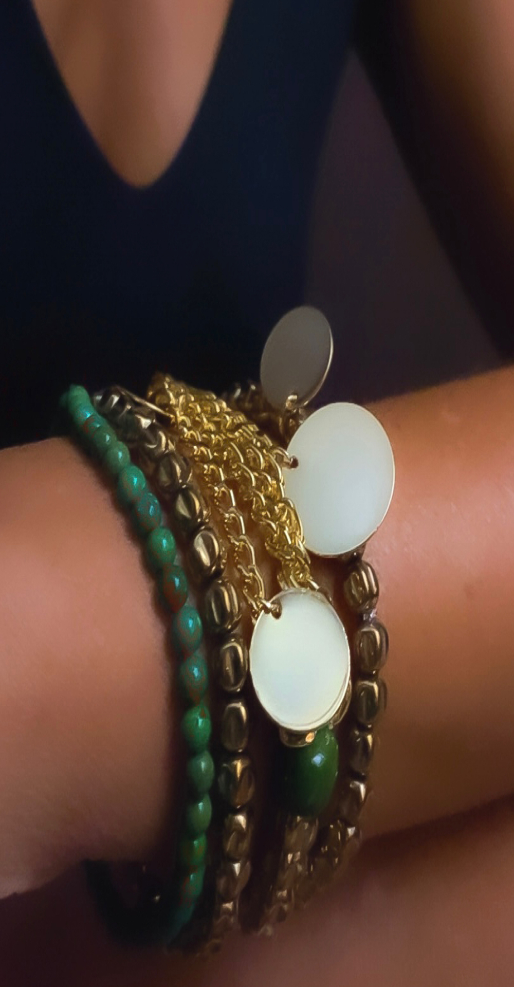 Kit com 4 pulseiras em pedras hematitas douradas, correntes e pedras naturais verdes, medalhas diamantadas.