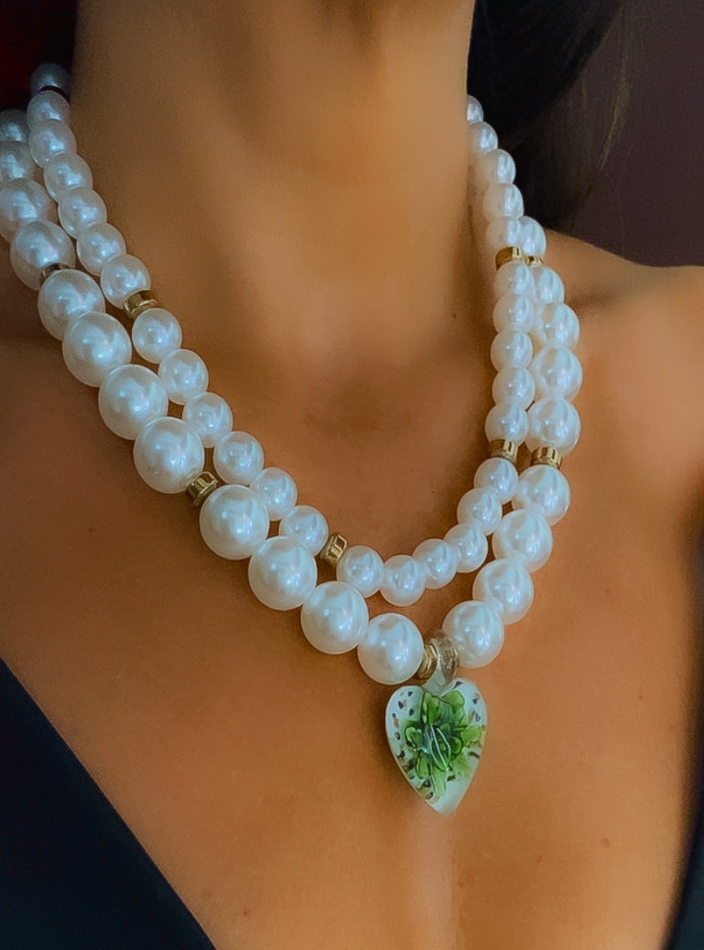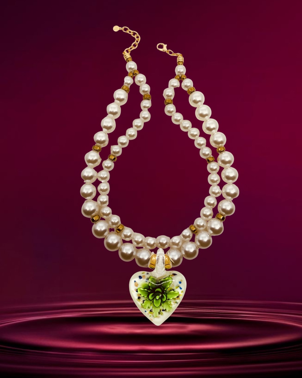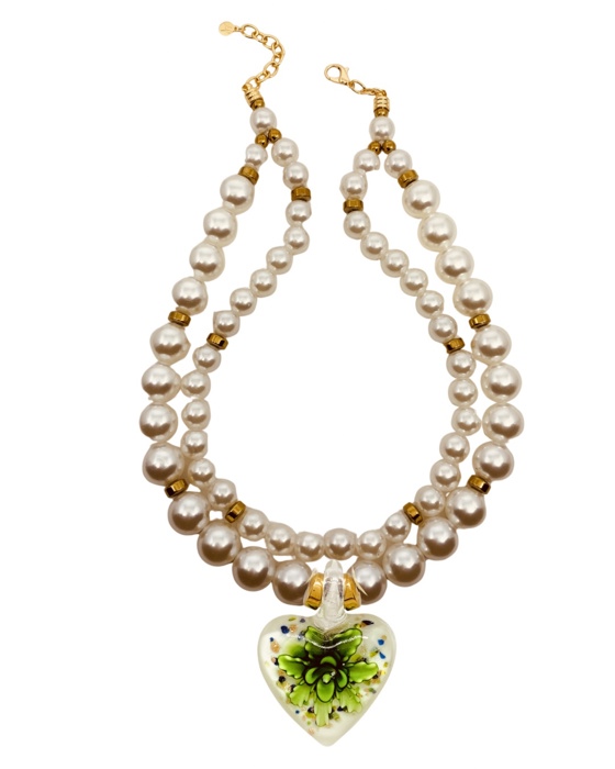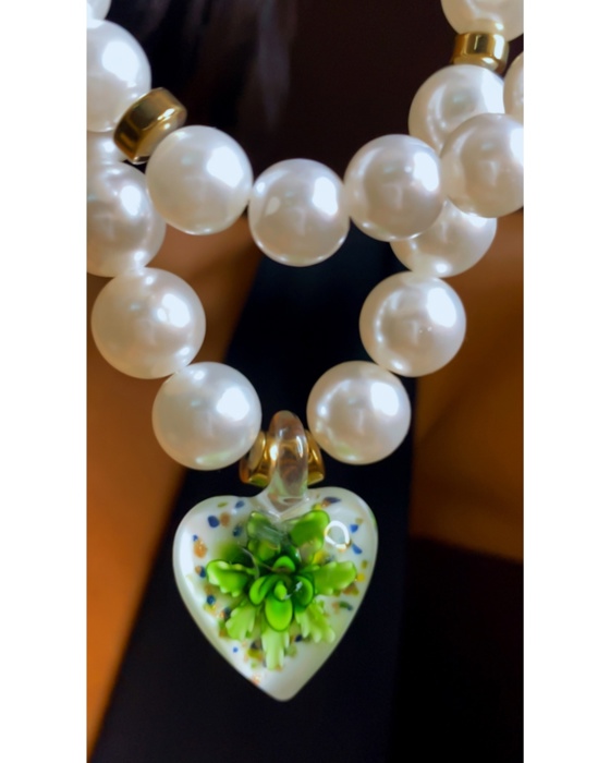 Colar em perolas e pedras, coracao em murano com flores verdes.