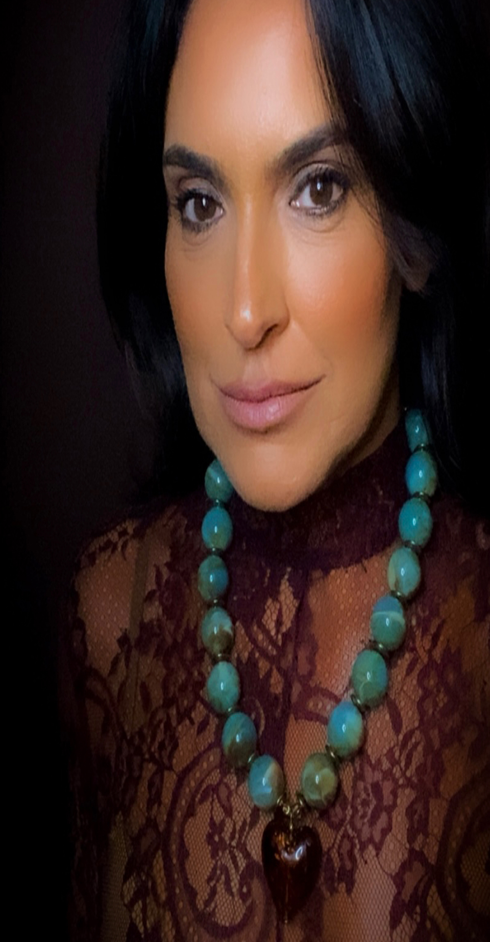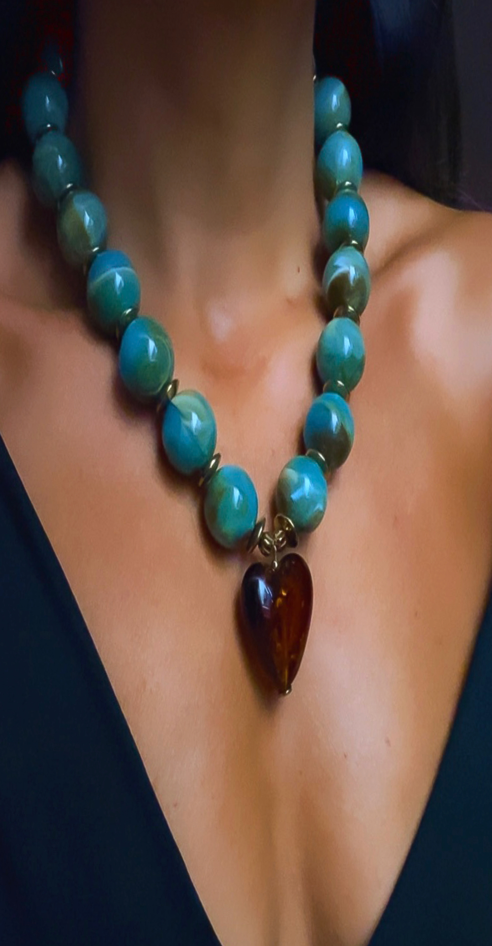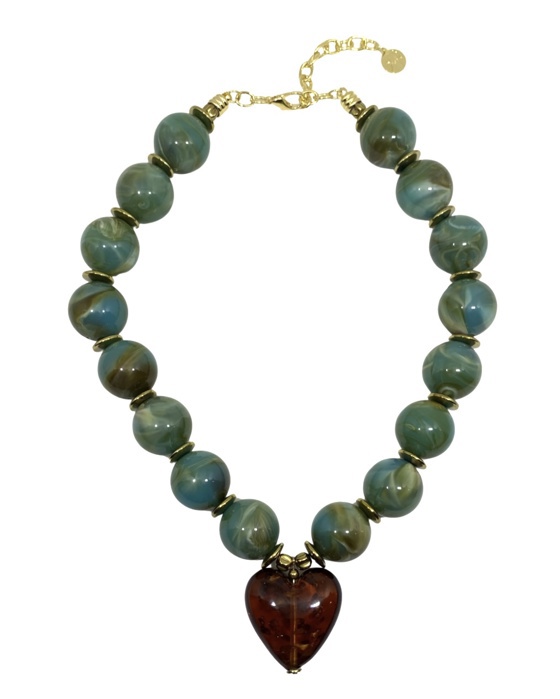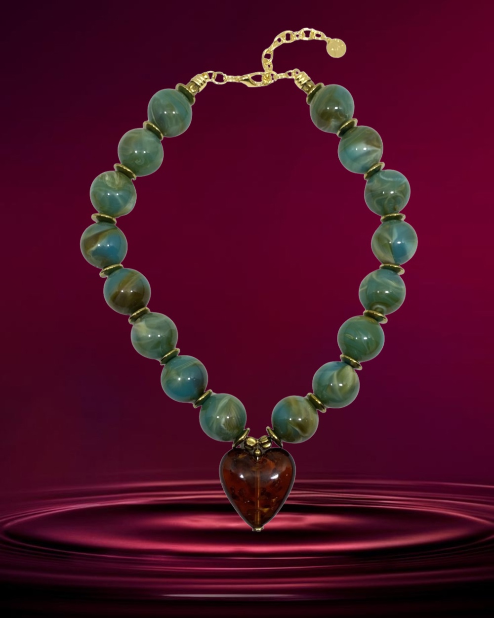 Colar com esferas ferdes em resinas, pedras hematitas douradas, coracao em murano café.