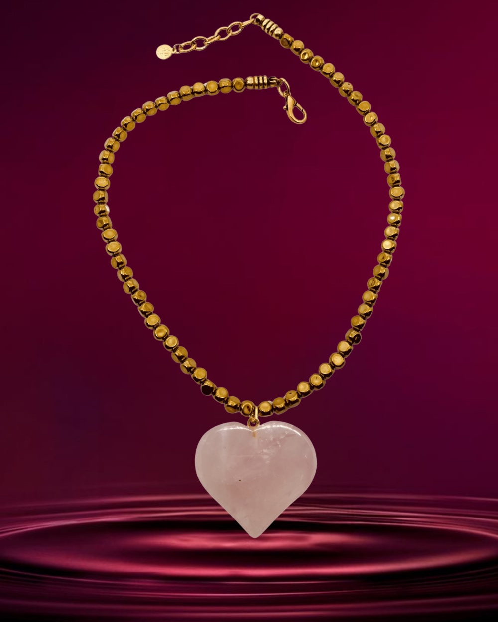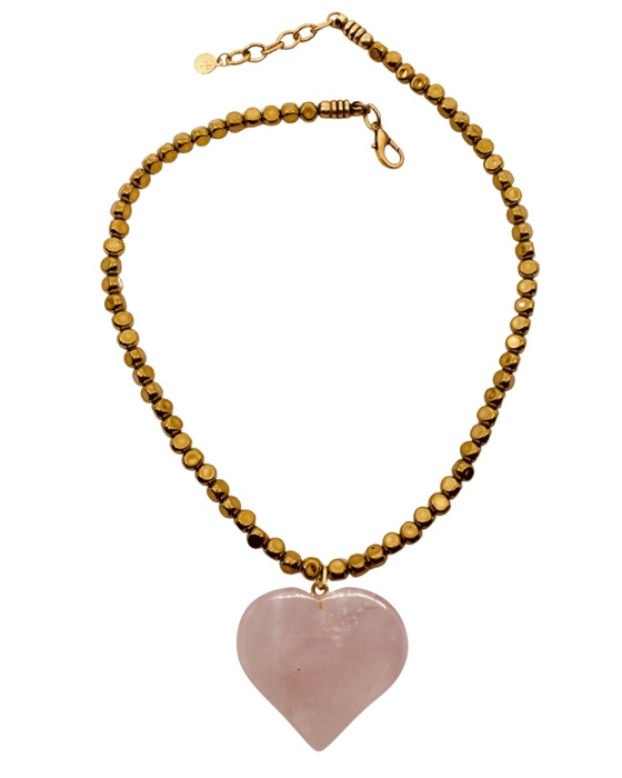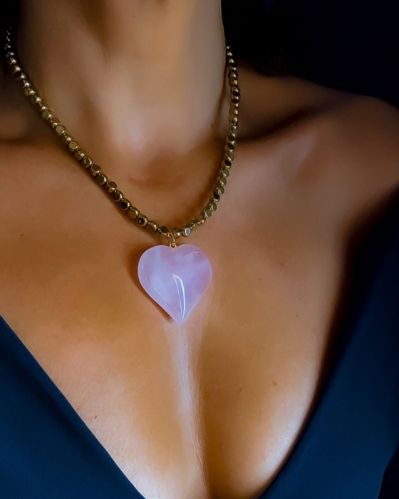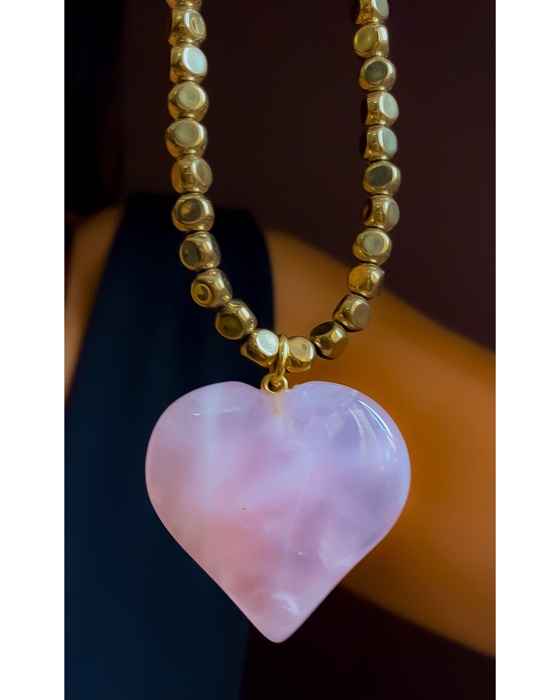 Colar com pedras hematitas, coracao em quartzo rosa