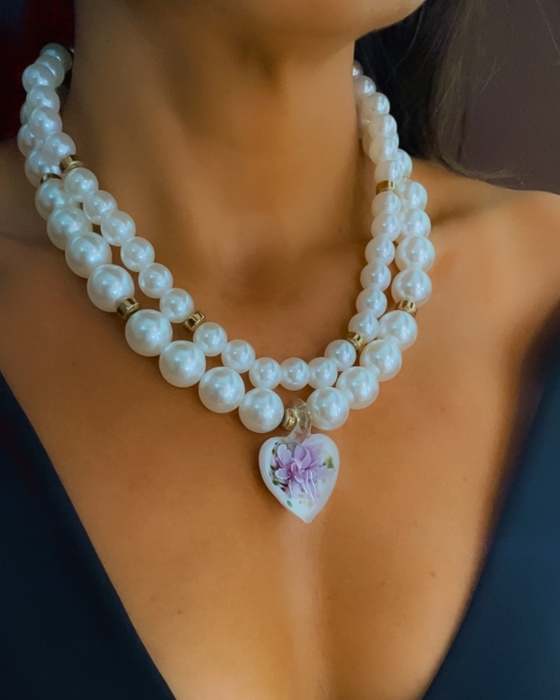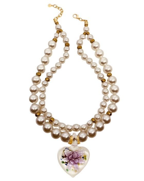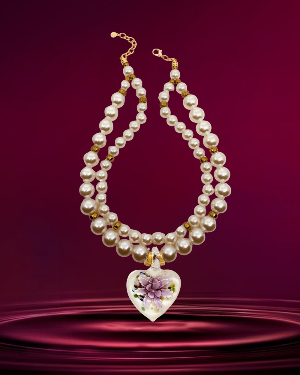 Colar em perolas e pedras, coracao em murano com flores lilas