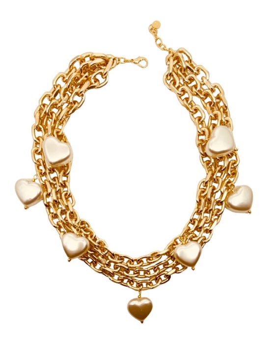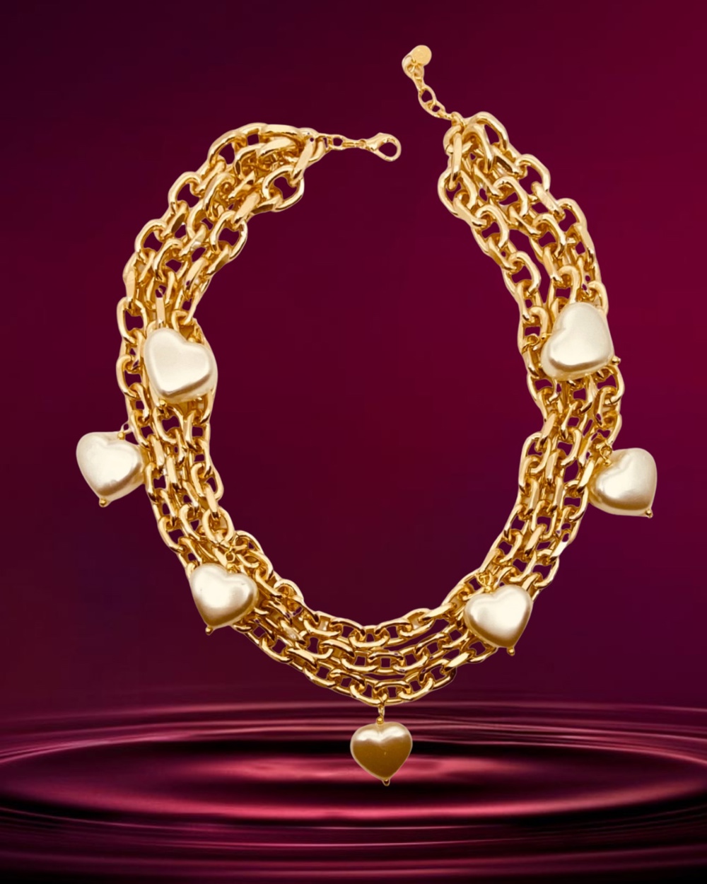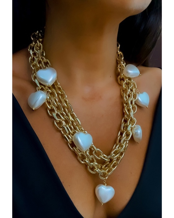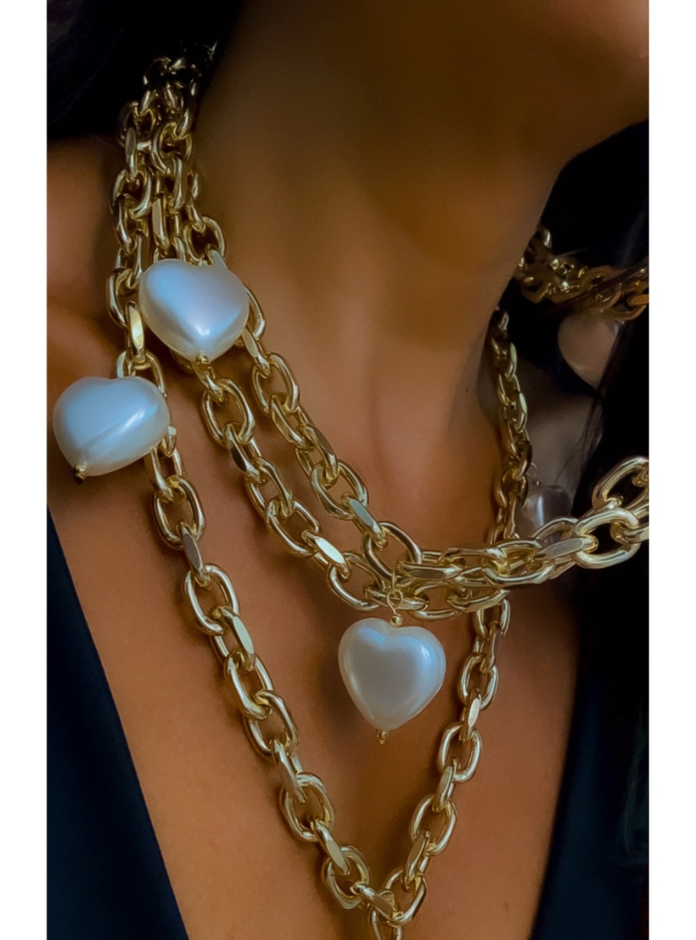 Colar maxi correntes 3 voltas com coracoes em perolas