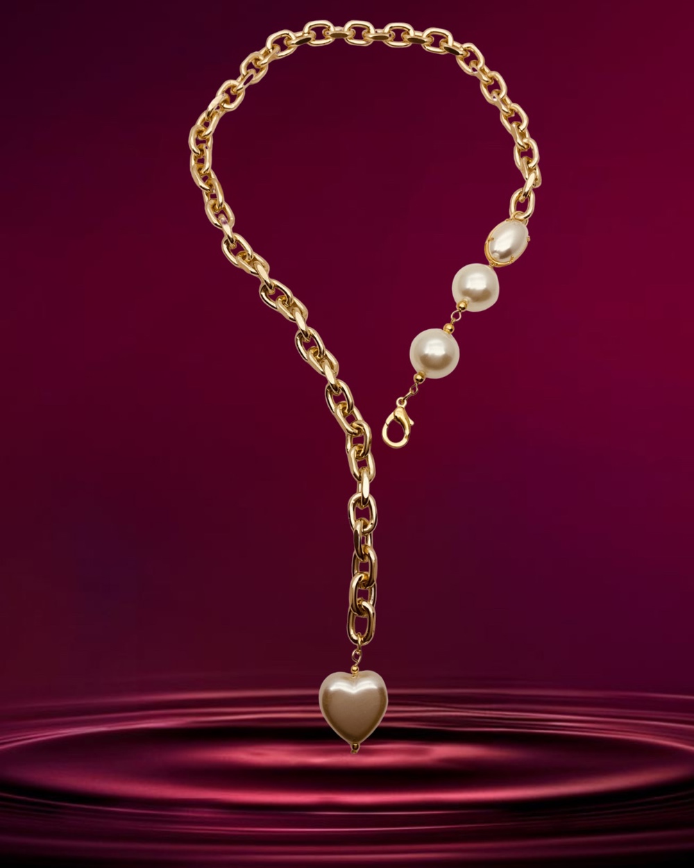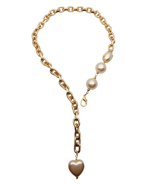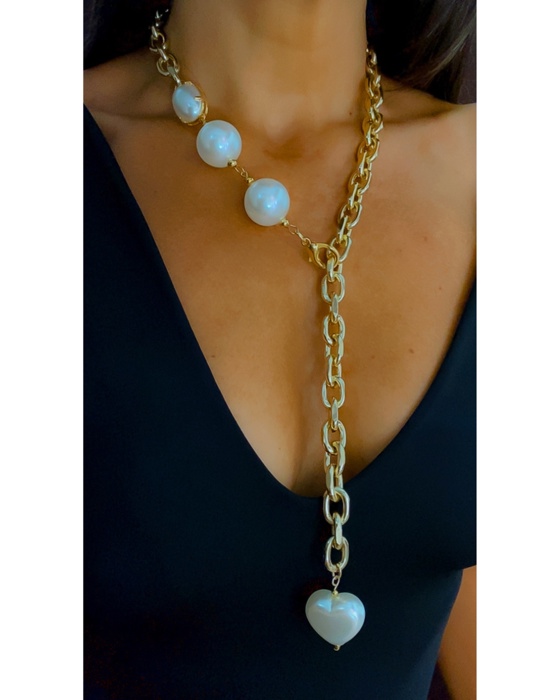 Colar gravata ajustavel, perolas e correntes.